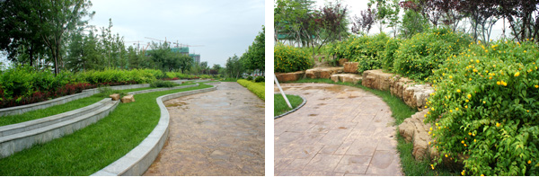而在道路十字路口的節(jié)點(diǎn)處,則主要是用10cm×10cm的小花崗巖鋪地,鋪出來的路面整潔、平坦,看似簡單,實(shí)則對施工技術(shù)要求相當(dāng)高。草坪中的地面鋪裝,則采用花崗巖汀步,用錯縫鋪裝法,兩塊花崗巖之間用草皮鑲嵌,就像給每塊花崗巖鑲了一道綠邊,與旁邊的草坪和諧地融為一體。貫穿整個工程的游憩步道,全部采用"人字形"的鋪裝方法,中間用透水磚、兩邊以花崗巖鑲邊,透水磚價格不高,用以鑲邊的花崗巖是利用了鋪裝中剩余的邊料,雖然用料簡單,但通過對技術(shù)的嚴(yán)格要求,鋪出的路面卻整潔而不失韻味,是一種實(shí)用、環(huán)保、節(jié)約的做法。