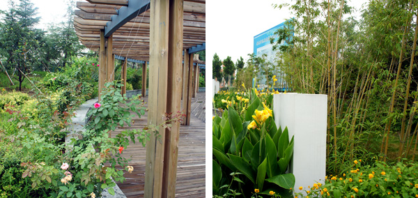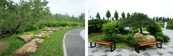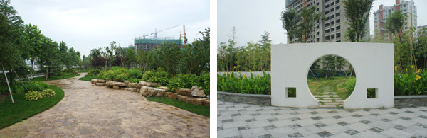 每個景觀節(jié)點(diǎn)上,植物的配置方法都是不一樣的,如在下沉廣場,主要是以小龍柏、金葉女貞等小灌木片植成方形或弧形,間或點(diǎn)綴石楠、梅樹,看起來規(guī)整、簡潔;而在設(shè)計風(fēng)格為江南園林的南廣場上,是將貴重的造型油松單植,通過不同的組合,形成三個風(fēng)格相近的綠島,周邊種植美人蕉、玉簪、竹子,并砌起白墻,上面開圓形拱門或圓窗,散發(fā)出詩意江南的靜謐和婉約氣息。"游憩步道是貫穿整個景觀的軸線,為了形成曲徑通幽的景觀效果,我們將對植、孤植、叢植都多種方法結(jié)合運(yùn)用,特別是在三叉路口,多種植海棠、櫻花、杏花等,一方面,花開的時候,綠葉間繁花點(diǎn)點(diǎn),會吸引人們不斷向前探尋更多的美景;而花落之后,茂密的枝葉又形成隱隱約約的視覺感受,前方轉(zhuǎn)過彎后風(fēng)景什么樣,又讓人很想去看看。"高經(jīng)理笑著說。