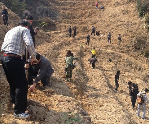 此次種植的是油茶小苗,為了提高樹苗的成活率,專門請來當(dāng)?shù)剞r(nóng)民,詳細(xì)講解種植的步驟、間距等種植要點(diǎn)及注意事項(xiàng)。隨后,大家兩人一組,興致高昂地開始了種樹,挖穴、種苗、填土……經(jīng)過一個小時(shí)的緊張勞動,500多株油茶樹就種好了。