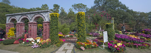 作品最大特色之處在于對(duì)原地形的充分利用及合理改造,依山勢(shì),按水理,精細(xì)打造每一個(gè)駐步休憩之所,搭配這種菊花,或色彩,或形狀,以此營設(shè)自然而又不失韻味的菊花景觀。最后,讓人融入其中,步伐、氣息、身影混雜交錯(cuò),展示出城市生活中人們努力追求或回憶的一種起居文化,亦或是一種清凈、淡雅的“和”文化。