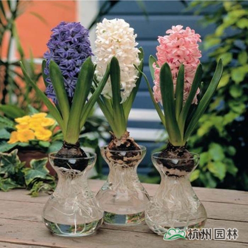 風(fēng)信子:目前市場上常見的風(fēng)信子有粉、藍、玫紅、紫、白等品種,其中以藍、粉、紫最受歡迎。選購時要挑個頭大而飽滿的,抓在手上硬實偏重,根部不發(fā)霉,生長點未受破壞的種球。11月下旬種植,在陰冷的環(huán)境下放置兩個月左右,這樣處理可以減少后期夾箭的概率,也有利于根系的生長,待花芽長至5cm左右時移至光線充足的區(qū)域即可。風(fēng)信子也可水培,但較盆栽一般花箭短、花朵少,花期也會短一周左右。