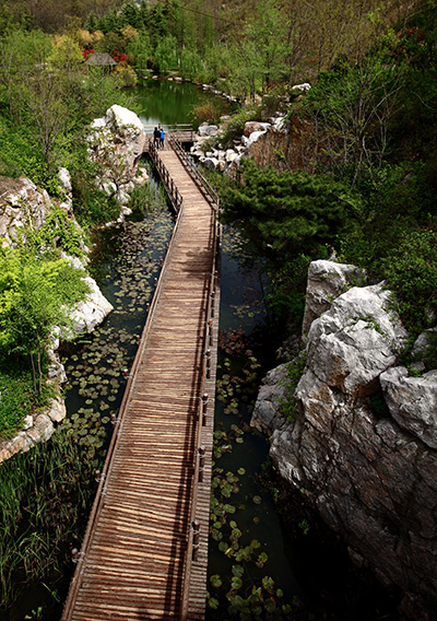 四大靜園位于北坡,分別名為彩徑觀花園、石林聽濤園、秀谷韻樂園和唱竹攬翠園,四個(gè)園子主題明確,景深豐富,個(gè)性分明,匠心獨(dú)具,一草一木別有風(fēng)韻。其中,石林聽濤園位于公園西南側(cè),是一座秀美的古典園林,具有濃郁的江南水鄉(xiāng)特色,由紅梅、南天竹、臘梅等植物組成的漂亮花境,給人帶來(lái)賞心悅目之感;蜿蜒曲折的木棧道則連接起了園內(nèi)的汀步和園路,帶領(lǐng)游人去欣賞園內(nèi)的每一處美景。唱竹攬翠園位于公園中部,全園格局顯得緊湊自然,豐富的植物應(yīng)用,使得園內(nèi)一年四季景色各異,特別是剛竹、紫竹、鳳尾竹、湘妃竹、慈孝竹等竹子的應(yīng)用,更是呼應(yīng)園名,行走在園內(nèi),伴隨著陣陣清風(fēng)徐來(lái),讓人仿佛置身于“竹海聽濤”的悠閑意境中。