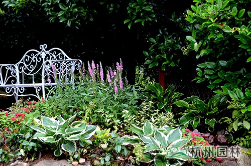英式花境中,以穗花婆婆納為焦點,通過花葉玉簪、礬根、檸檬羅勒、紅尾鐵莧、花葉絡(luò)石的配置,并與鐵藝座椅形成愜意的休閑氛圍。