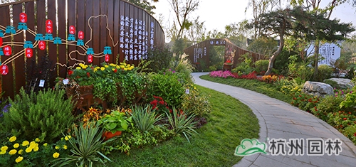 考慮到銀川的干燥氣候,垂直綠化墻植物的保濕成為難題。“浙江園”垂直綠化墻以無紡布為墻體材料,使用保濕性強的基質(zhì),優(yōu)選植物種類,同時搭配滴灌系統(tǒng),保證了綠化墻鮮花擁簇的景象。展園內(nèi)的垂直綠化墻設(shè)計簡潔、曲線優(yōu)美,與以錢塘江文化為主題的背景墻相互映襯,共同展現(xiàn)了新時期浙江園林景觀的不斷發(fā)展與創(chuàng)新。