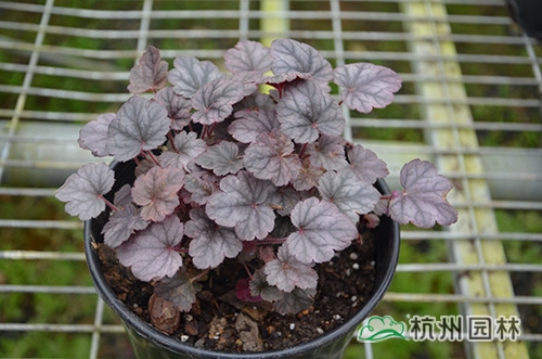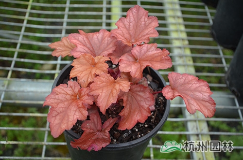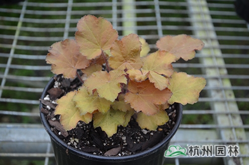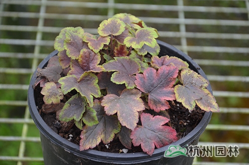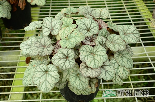 礬根又名小花腎形草,英文名為“Alum root”(因根部不規(guī)則膨脹而來(lái)),因此在引入中國(guó)的時(shí)候被翻譯成了“礬根”。礬根葉色繁多,且葉色會(huì)隨著季節(jié)、環(huán)境、溫度和光照條件的變化而改變。例如,‘蜜桃黃’在春天的時(shí)候,葉子展現(xiàn)出細(xì)膩的銀色光澤,成熟的葉片顏色會(huì)呈現(xiàn)紫色并略帶玫瑰紅;‘赤砂巖紅’的葉色會(huì)從桃紅色變?yōu)榱零~黃色,再變?yōu)榫G色帶有琥珀色;‘貴族紫’葉子的顏色會(huì)保持穩(wěn)定的紫色,冬天的葉子會(huì)變成銀色。