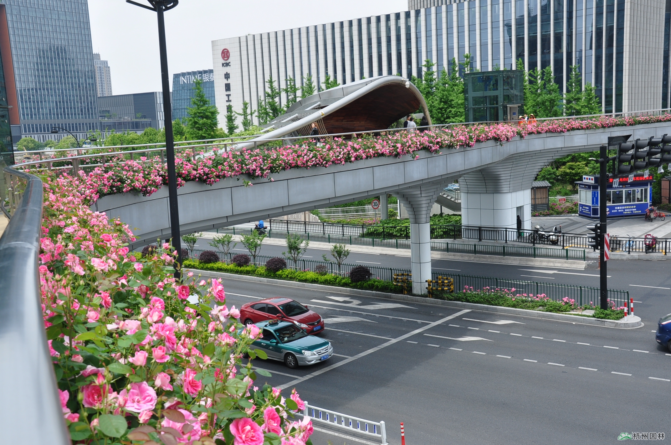 位于新塘路和慶春路交叉口的慶新天橋是新塘路綜合整治工程的標(biāo)志性建筑之一,也是杭州首座仿生態(tài)學(xué)原理的異形人行天橋。橋面獨(dú)特的景觀造型宛如一條風(fēng)景秀美的彩色飄帶,大量月季沿橋面外側(cè)護(hù)欄種植,月季花盛開時(shí)節(jié),橋面仿佛戴上了一條色彩絢麗的花環(huán),美不勝收,充分體現(xiàn)了杭州包容、大氣、開放的時(shí)代風(fēng)貌、都市氣質(zhì)和國際視野。