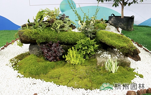 現(xiàn)場共布置了四個(gè)小場景,前方左側(cè)以自然形狀的植物造景為主,通過各種花開植物與常綠、色葉等植物的巧妙搭配,展現(xiàn)庭院中向陽處的植物應(yīng)用和景觀效果;前方右側(cè)以各種塔形、圓形、方形、球形等造型植物為主,通過高低錯(cuò)落的有機(jī)布置,展現(xiàn)各種造型植物在景觀中的應(yīng)用效果;后方左側(cè)以松磷堆疊出地形,用佛甲草圍合,以金鐘花、月桂等植物點(diǎn)綴,展示庭院一角的造景效果;后方右側(cè)則是一處苔蘚微景觀,以白石子鋪底,通過枯木、苔蘚、礬根及豐富的蕨類植物等的搭配,配以起伏的地形,營造出一片寧靜清新的小森林般的陰生景觀。