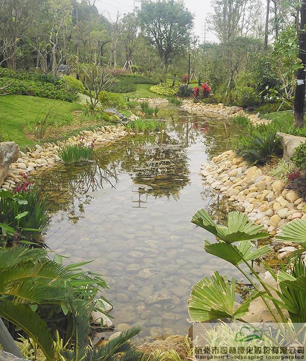 下雨時(shí)蓄水,用于植物的日常澆灌;干旱時(shí),鋪滿(mǎn)鵝卵石的水底又可與周邊豐富的植物營(yíng)造出另一種園林意境