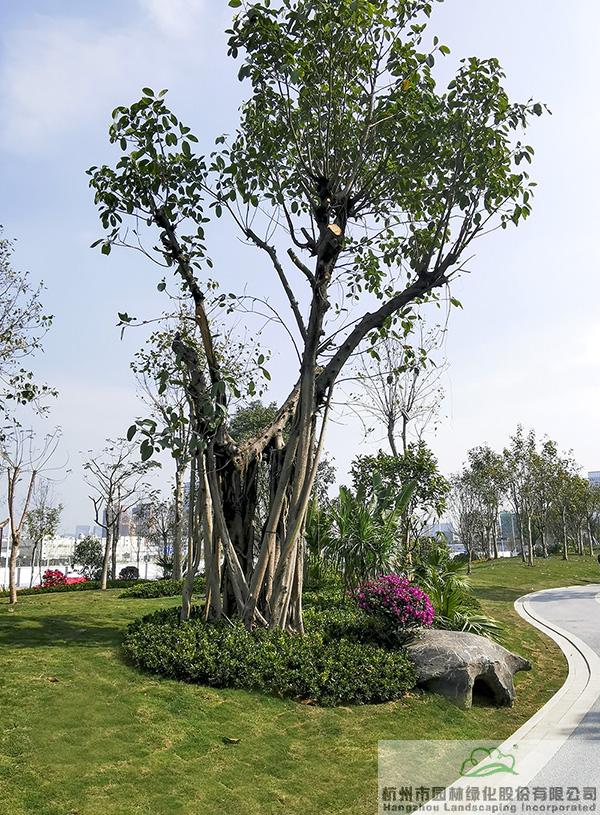 地被植物和小灌木充實(shí)園林的下層空間,往往起到“鑲邊”的效果,如果種植不好,很容易使底部出現(xiàn)裸露的土壤,景觀效果大打折扣。而該項(xiàng)目在現(xiàn)場(chǎng)放樣之后,先對(duì)地形進(jìn)行處理,形成一定的坡度,然后在地被植物或小灌木種植時(shí),上面坡度高的地方平種,隨著逐漸向下方邊緣靠近,植物種植向下方傾斜,逐步過(guò)渡,從上到下形成弧線,將土壤遮蓋。“這種處理手法,不但使下層空間看著自然美觀,而且避免了地面出現(xiàn)裸露情況。”葉偉華的言語(yǔ)中,不經(jīng)意間流露的,是杭園人對(duì)細(xì)節(jié)的極致追求。