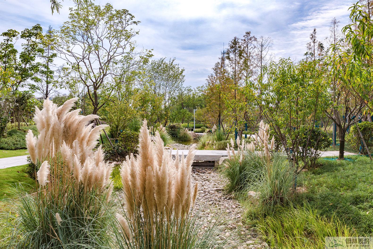 旱溪景觀同樣是海綿城市理念的應(yīng)用典范,下雨時蓄水,既可用于植物的日常澆灌,又能營造出清新靈動的水景;干旱時,鋪滿鵝卵石的水底又可與周邊豐富的植物營造出另一種園林意境。
