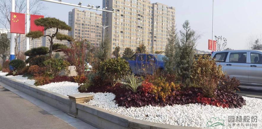 在江山大道與黃山路、黃浦江路與項王路路口在植物配置上,采用群落結(jié)構(gòu)、組團(tuán)配置和盆景化的自然式造園手法,在空間、色彩、節(jié)奏方面獨具匠心,打造了高低錯落、疏密有致的和諧景觀。考慮到行車安全性與視線誘導(dǎo)因素。考慮到行車安全性與視線誘導(dǎo)因素,中央綠化隔離帶以黑松樁的種植片段和花鏡+球類的自然群落片段進(jìn)行循環(huán),打造規(guī)則中有自然的效果。機(jī)非綠化隔離帶以黑松樁+花鏡種植,打造艷麗的春景效果。
