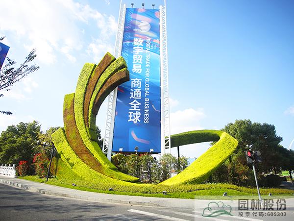 為增加數(shù)貿(mào)展會主題在邊側(cè)帶內(nèi)設(shè)置3座綠雕:杭扇-以扇子造型主題的全球數(shù)字貿(mào)易博覽會綠雕,展-以全球數(shù)字貿(mào)易博覽會會徽造型綠雕,數(shù)貿(mào)-以飄帶造型主題的“數(shù)貿(mào)錢潮 杭向未來”綠雕。綠雕植物均采用佛甲草和五色草搭配,周邊采用三角梅及花鏡植物配置。港南大道島頭花鏡運(yùn)用金姬錐、彩葉球、細(xì)葉芒、塞娜等植物來強(qiáng)化迎賓氣氛,通過多年生地被草花,結(jié)合精致植物組團(tuán)+特色綠雕,共同營造多彩氛圍,打造熱烈迎賓門戶。