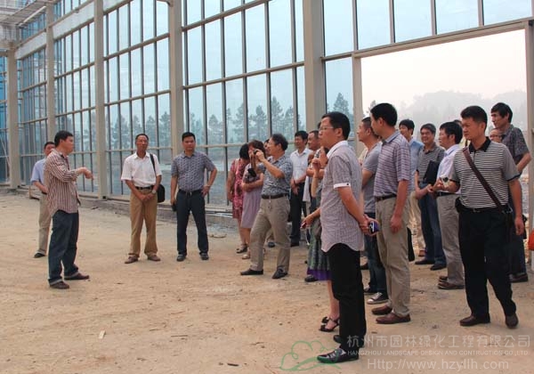 會(huì)議開始之前,在“以興林富民為重點(diǎn),以項(xiàng)目建設(shè)為抓手,加快推進(jìn)林業(yè)產(chǎn)業(yè)、科技推廣、林木種苗事業(yè)發(fā)展”指導(dǎo)思想的指引下,楊文鐘副局長(zhǎng)和與會(huì)代表一起參觀考察了杭州市園林綠化工程有限公司的“園藝設(shè)施農(nóng)業(yè)示范園——青山湖?花園中心”項(xiàng)目現(xiàn)場(chǎng),詳細(xì)了解了智能玻璃溫室、鋼架蔭棚、容器苗區(qū)等主要生產(chǎn)設(shè)施設(shè)備和附屬配套設(shè)施的建設(shè)情況。公司總經(jīng)理張炎良、副總經(jīng)理丁旭升、研發(fā)中心經(jīng)理沈柏春陪同參觀。